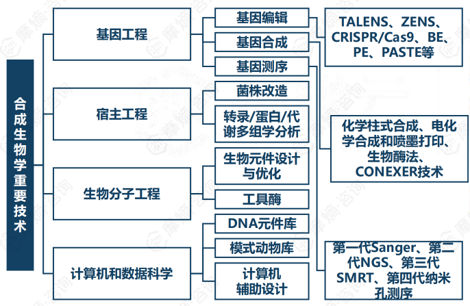 合成生物学的重要技术包括基因工程(如基因编辑、基因合成、基因测序)、宿主工程(如菌株改造、转录/蛋白/代谢多组学分析)、生物分子工程(如生物元件设计与优化、工具酶)以及计算机和数据科学(如DNA元件库、模式动物库、计算机辅助设计)等。