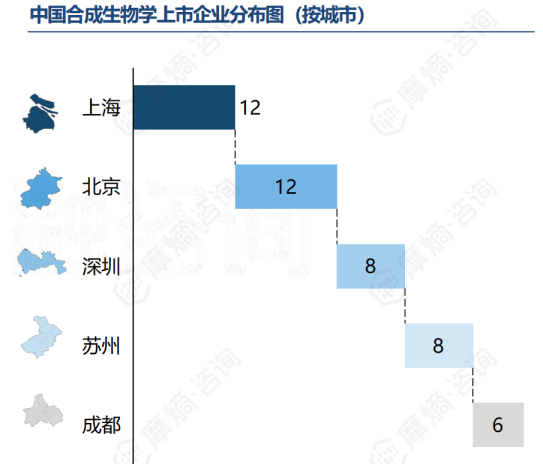 具体来看,上海、北京、深圳、苏州、成都合成生物学领域上市公司数量最多,占比超39.7%。其中上海12家、北京12家、深圳、苏州各8家、成都6家。