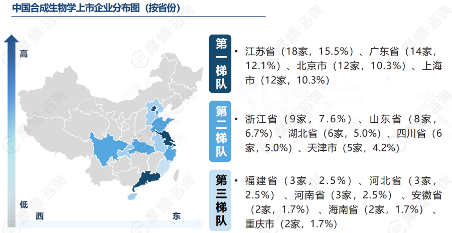 中国合成生物学上市企业呈现出明显的地域集中趋势。这些企业多聚集在沿海区域,尤其是江苏、上海、广东、北京等省市直辖区,以及上海、北京、深圳、苏州、成都等核心城市。这些地区不仅拥有优越的地理位置和丰富的资源,还具备完善的产业体系和政策支持,为合成生物学企业的发展提供了良好的环境。