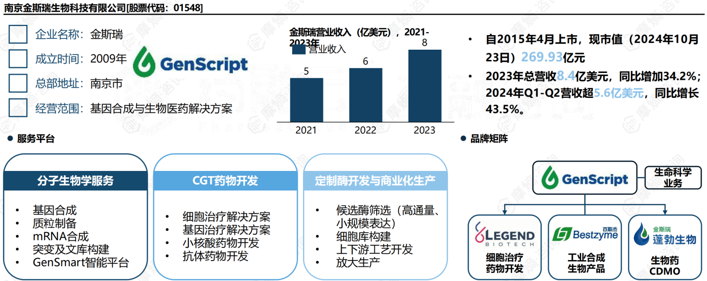 金斯瑞生物科技是全球最大的基因供应商之一,深耕生命科学服务与产品领域近20年。基于坚实的DNA合成技术,金斯瑞逐步从一家基因供应商发展为全面的全球领先的科研和生产服务商。其四大主要业务单元——生命科学服务及产品、生物制剂合约开发及生产(CDMO)、工业合成产品、综合性全球细胞疗法,均在全球范围内享有盛誉。