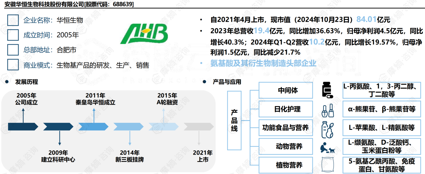 华恒生物是一家以合成生物技术为核心的高新技术企业,专注于氨基酸及其衍生物的研发与生产,是全球领先的丙氨酸生产企业之一。通过持续的技术创新和研发投入,华恒生物保持了在厌氧发酵工艺上的国际领先地位,并在绿色科技创新方面具有显著优势。