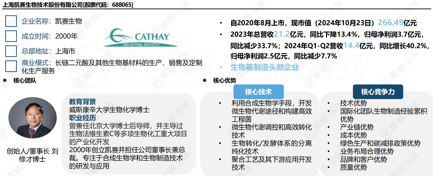 凯赛生物是合成生物学领域的龙头企业,业务聚焦于生物基聚酰胺产业链,核心产品包括长链二元酸和生物基戊二胺等。其核心竞争力在于强大的技术研发能力、高市场占有率以及绿色生产技术。通过生物制造方法生产新型材料,具有环保优势,凯赛生物在全球市场上占据主导地位。