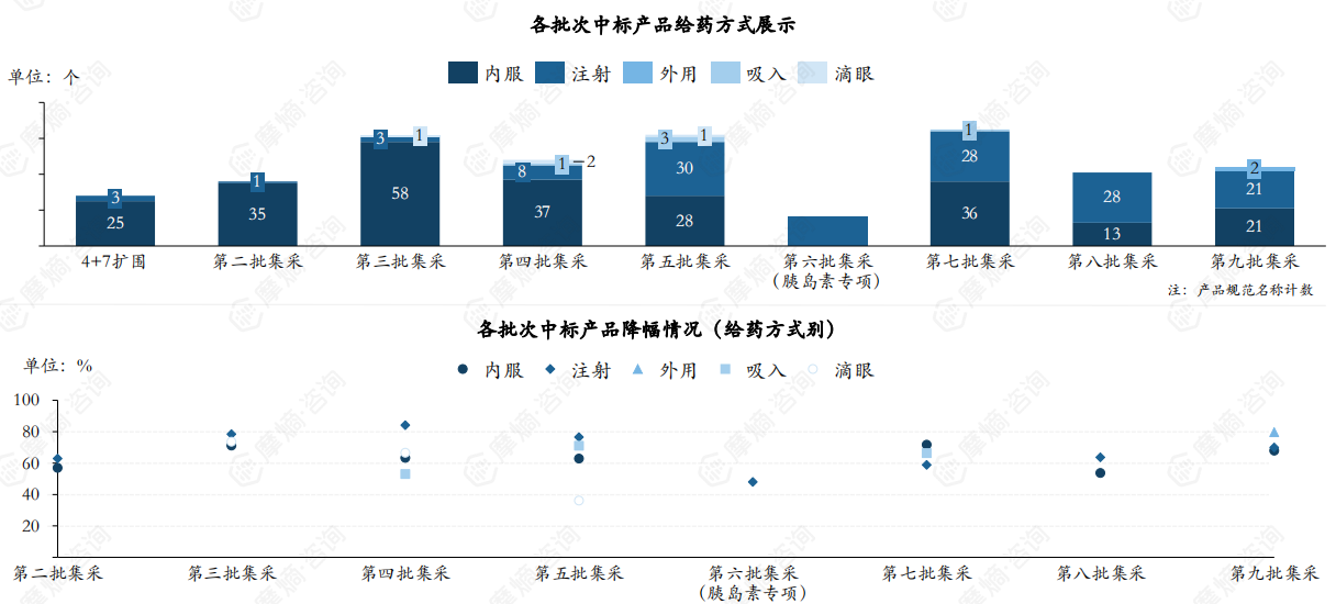 自第五批集采后,注射类给药产品采购占比增大,各类给药方式批次间降幅较稳定。