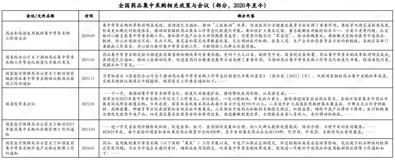 常态化进行的药品集中采购。2021年《国务院办公厅关于推动药品集中带量采购工作常态化制度化开展的意见》就明确提到按照保基本、保临床的原则,重点将基本医保药品目录内用量大、采购金额高的药品纳入采购范围,逐步覆盖国内上市的临床必需、质量可靠的各类药品,做到应采尽采。近年来基于竞争格局、市场情况,每年都组织进行国家药品集中采购。
