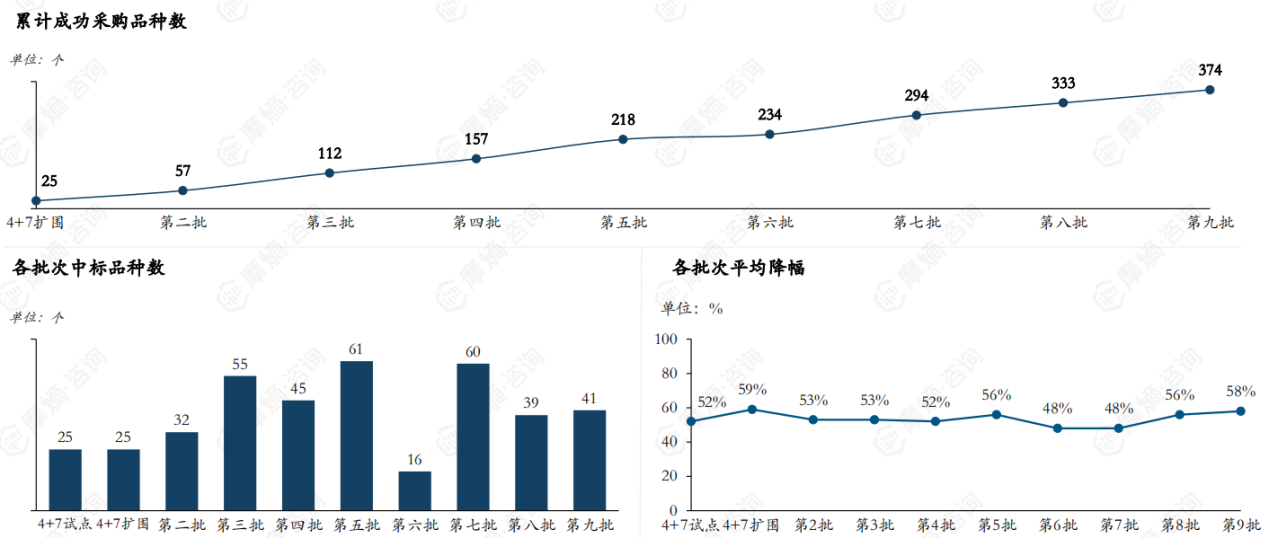 · 目前已完成9批国家药品集中采购,成功招采了374个品种