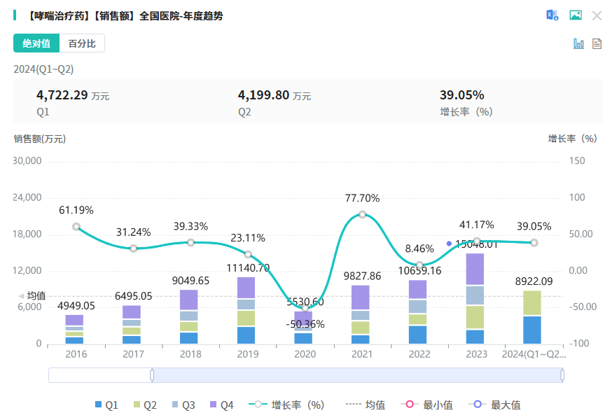 抗哮喘药物主要以处方药形式存在,医院历来是其主要的销售渠道,占据市场的主导位置。但随着国家医改政策的不断深化,医院处方外流的现象日益明显,这为全国院内市场提供了新的增长动力。据摩熵医药数据库统计,2023年全国院内市场(中成药)抗哮喘药物的销售额成功突破1亿元大关。同时,全国药店零售哮喘治疗药物(中成药)的销售规模也持续攀升,2014年上半年已超过1400万元,同比增长高达65%,市场前景乐观。