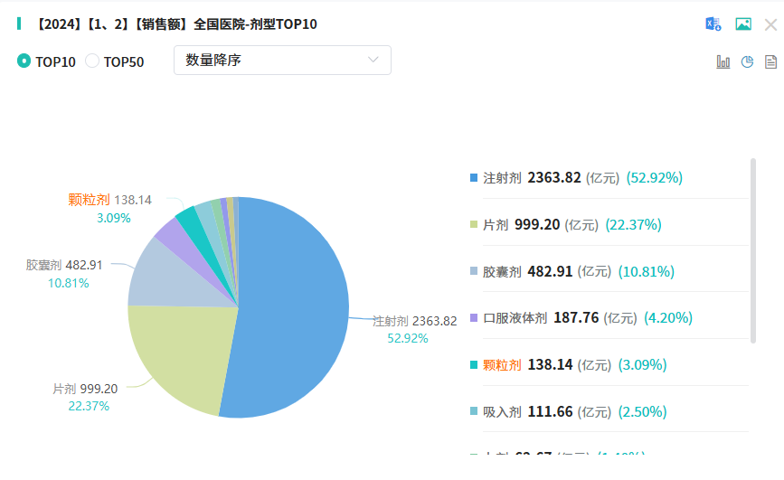 在药物剂型的分布格局中,注射剂以其近53%的市场份额,显著占据医院市场的榜首。紧随其后的是片剂,占据了22.37%的份额,表现稳健。胶囊剂则以10.81%的市场份额紧随其后,位列第三。