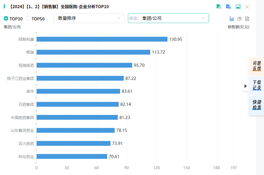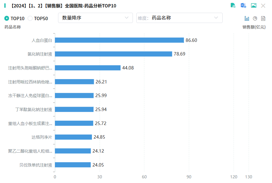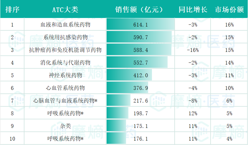 在市场份额的竞争中,排名前10的产品销售总额达386.25亿元,产品涵盖了多个治疗领域,其中3款血液和造血系统用药,3款系统用抗感染药,2款抗肿瘤药和免疫机能调节药、心血管系统用药和消化系统与代谢药物用药各有1款。