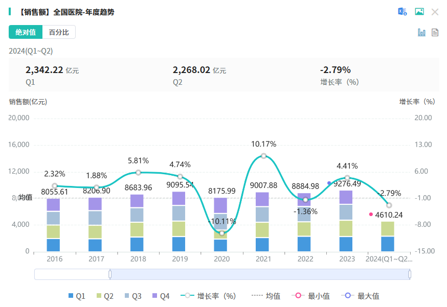随着中国疫情的全面放开,2023年医院药品市场迎来了强劲复苏,全国院内销售总额达到了9276.49亿元,同比增长4.41%,创下了近年来的新高。然而,进入2024年,市场似乎出现了一些波动。据摩熵医药数据库显示,2024年上半年全国医院药品销售市场总额为4610.24亿元,同比下降了2.79%。尽管如此,市场竞争依然白热化,各大药企纷纷发力,争夺市场份额。