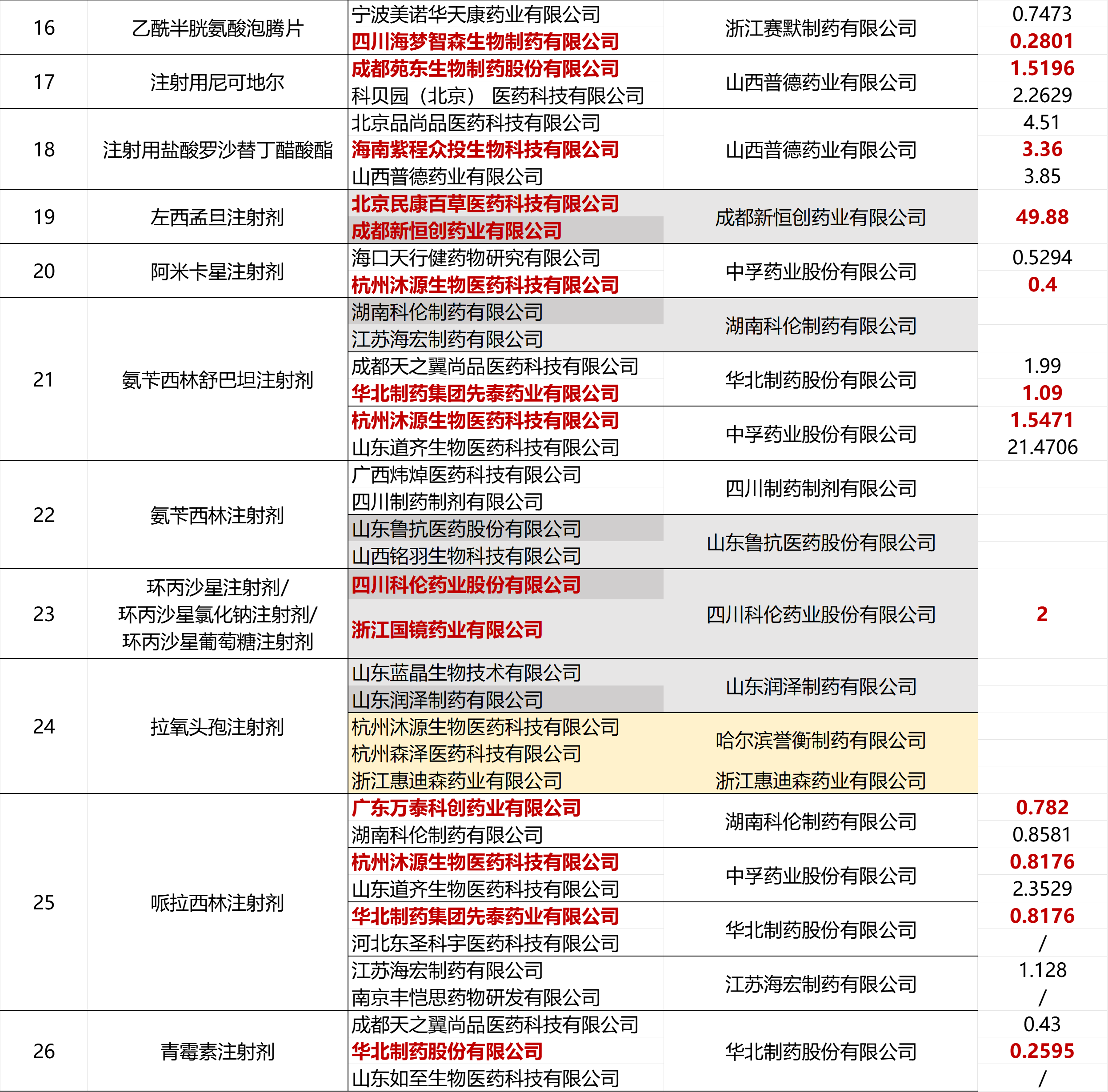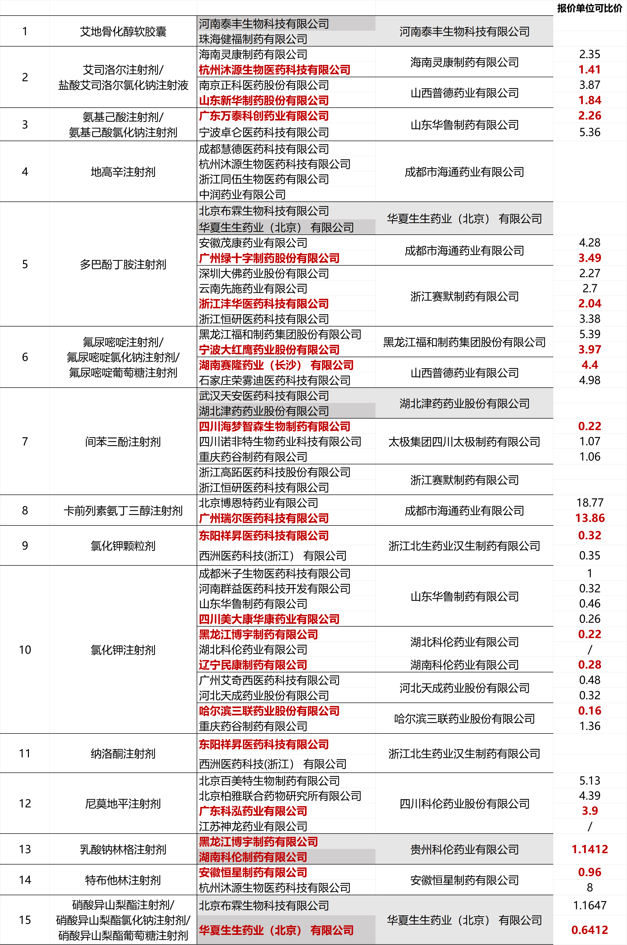 红色字体部分为最终拟中选企业,并附报价单位可比价参考(未中选企业未标价格);