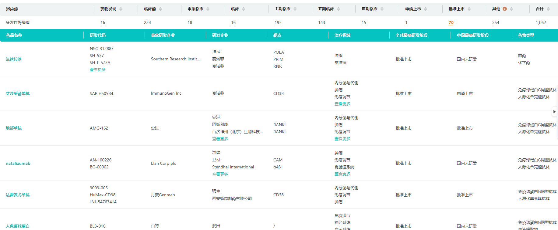 多发性骨髓瘤在研药物进度及详情查询(部分)
