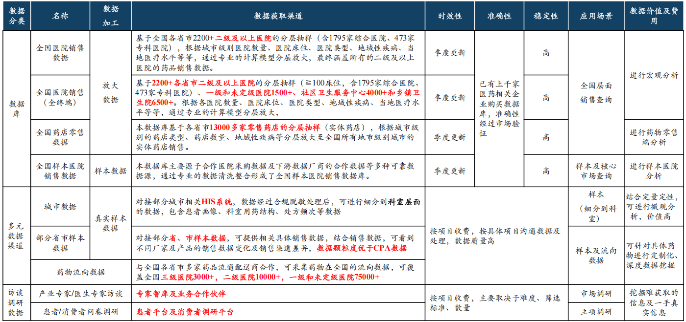 城市数据:对接部分城市相关HIS系统,数据经过合规脱敏处理后,可进行细分到科室层面的数据,包含患者画像、科室用药结构、处方频次等数据;对接部分省、市样本数据,可提供相关具体销售数据,结合销售数据,可看到不同厂家及产品的销售数据变化及销售渠道差异,数据颗粒度优于CPA数据。