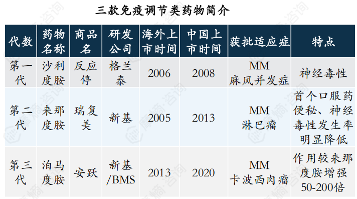 第一代的免疫调节药物,沙利度胺由德国制药公司Chemie Grunenthal 制造出来,作为减少孕吐药物使用,后证实会导致婴儿出生缺陷儿退出市场。2006年被FDA批准用于多发性骨髓瘤。