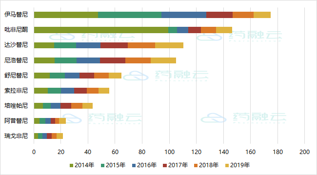 诺华的伊马替尼的全球销售额最好,在2014~2019年间累计销售额高达175亿美元;诺华用于治疗慢性粒细胞白血病的尼洛替尼,2014~2019年间的全球销售额高达105亿美元;百时美施贵宝用于治疗急性淋巴细胞白血病和慢性粒细胞白血病的达沙替尼,2014~2019年间的全球销售额高达110亿美元。