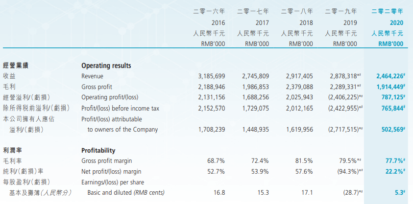 2020全年,四环医药经营收益达24.64亿元,受新冠疫情影响增速有所放缓,与2019年的总收益28.78亿元相比减少14.4%。实现毛利人民币19.14亿元,较2019年同比减少16.4%,集团整体毛利率为77.7%,主要由于年内原重点监控目录的药品销量大量下滑,而这些药品毛利率相对较高。
