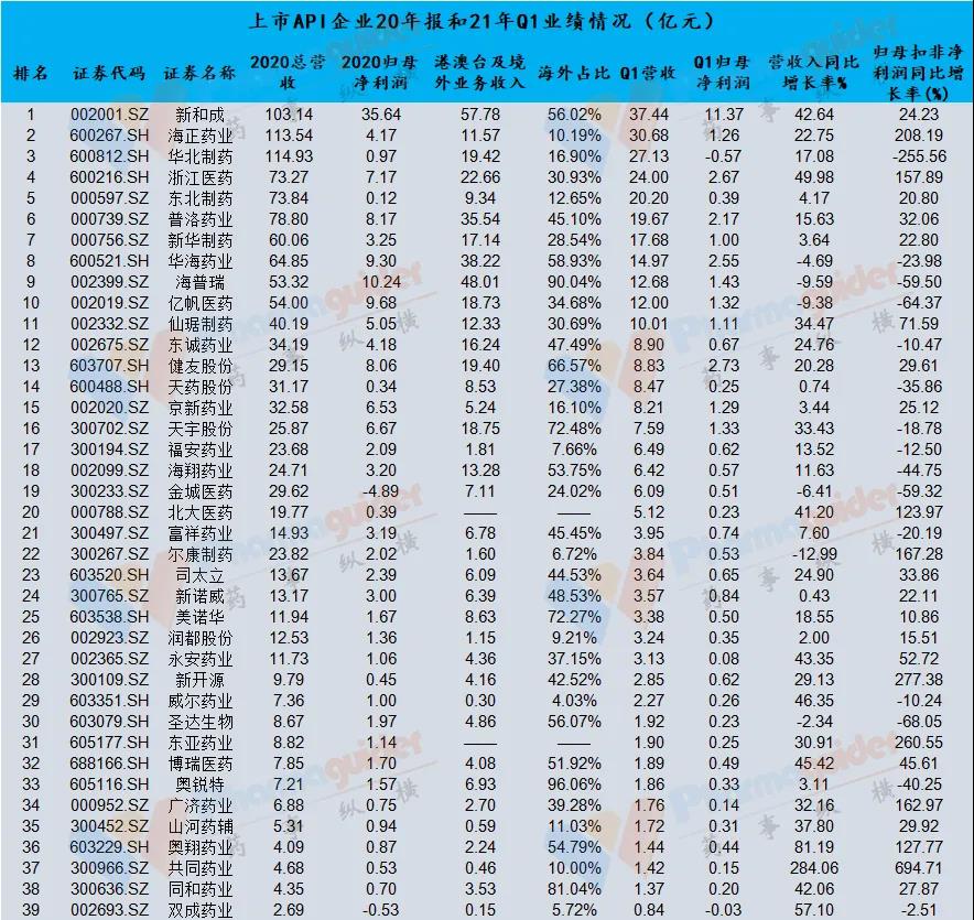 根据中信行业分类,目前上市化学原料药企有39家,已经全部发布一季报。21年Q1营收和净利润基本上都是大幅增长。从Q1营收体量来看,新和成和海正药业分别营收为37.4亿元和30.68亿元,排名前两位。