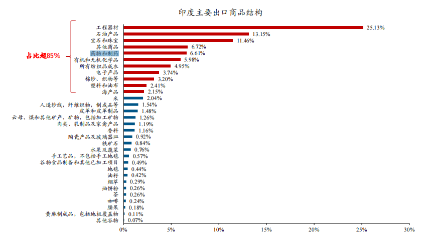 从印度主要出口商品结构来看,医药生物占比6.61%。