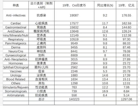 从出口制剂和API产品涉及领域来看,抗感染、胃肠类、糖尿病、营养和呼吸类排名靠前。