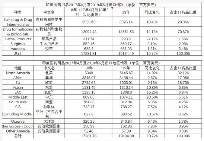 据申万宏源医药团队汇总印度医药用品出口数据来看,药物制剂和生物药占比70.87%最大,其次是原料药中间体20.36%。从出口地区来看,北美、非洲和欧盟排名前三。