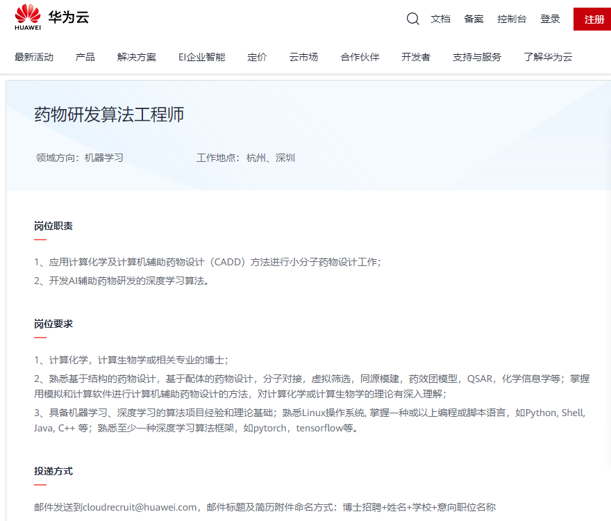 图片来源华为云:博士招聘 药物研发算法工程师
