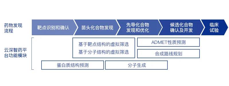 云深智药平台功能模块覆盖从「靶点识别和确定」到「候选化合物确认及开发」等整个流程