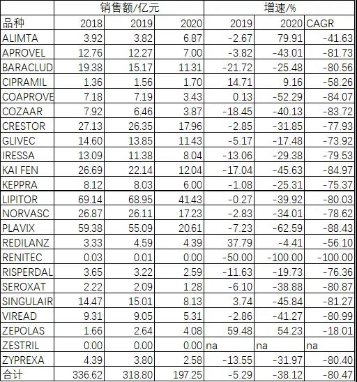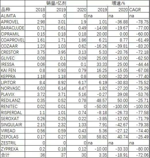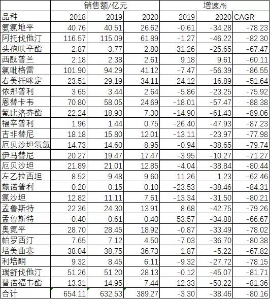 经过过去两年的销售数据分析(参考IMS入院价),第一轮集采中选的25个品种2020年总销售额为389.27亿元,与2018年的654.11亿元相比,市场规模萎缩了40.49%,总销量则从2018年的110.00亿剂增长到129.80亿剂,增长了18.02%。原研药总销售额从2018年的336.62亿元下降至197.25亿元,总销量从35.51亿剂下降至29.76亿剂,仿制药总销售额则从2018年的317.49亿元下降至192.01亿元,总销量从74.45亿剂上升至100.02亿剂。