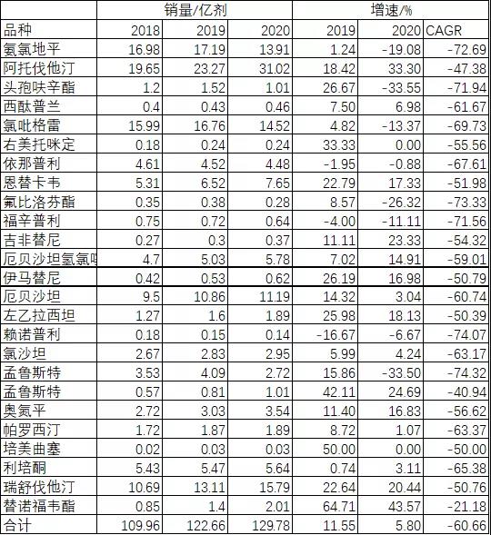 医院端方面,第一轮集采中选的25个品种2020年总销售额为292.50亿元,与2018年的547.44亿元相比,市场规模萎缩了46.57%,总销量则从2018年的83.05亿剂增长到99.48亿剂,增长了19.78%。原研药总销售额从2018年的297.60亿元下降至140.47亿元,总销量从28.30亿剂下降至19.48亿剂,仿制药总销售额则从2018年的267.84亿元下降至152.03亿元,总销量从54.75亿剂上升至80.01亿剂,仿制药处方率从65.82%上升至80.42%,仿制药替代效应明显。