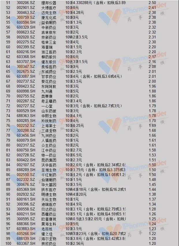 上市药企分红总额Top100排名如下