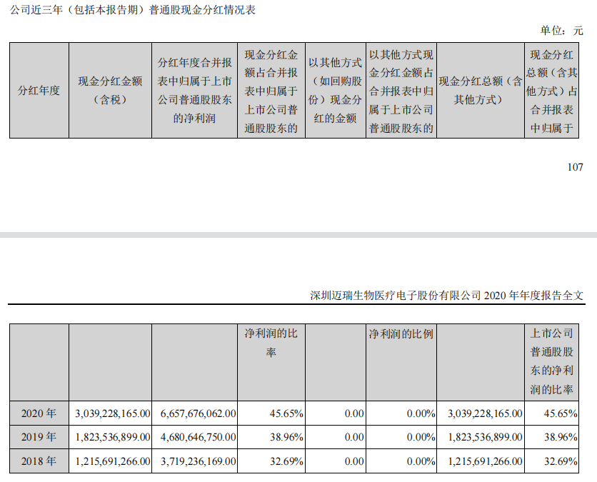 第二名迈瑞医疗,公司拟以截至2020年12月31日的总股本1,215,691,266股为基数,向全体股东每10股派发现金股利人民币25元(含税),共计派发现金股利人民币3,039,228,165元(含税)。
