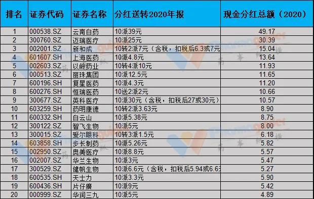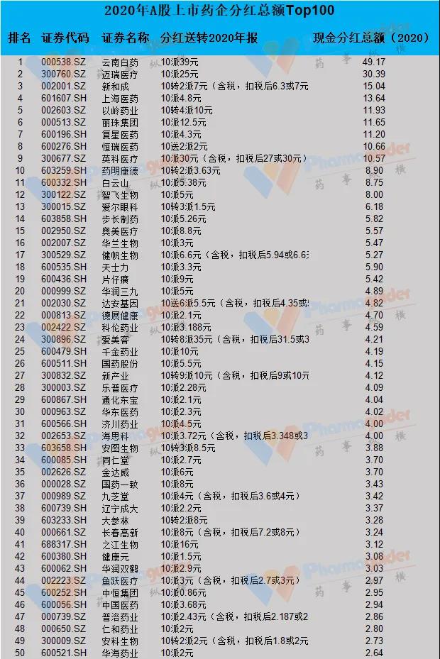 我们根据年报梳理下,看看A股上市药企top20分红情况如何,按照现金分红总额排序: