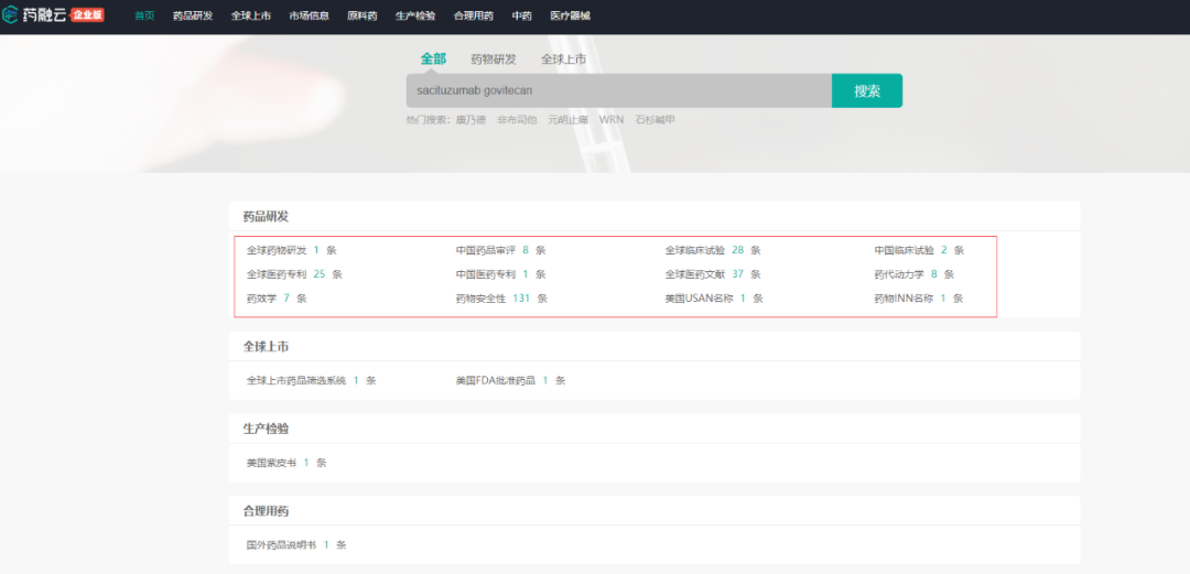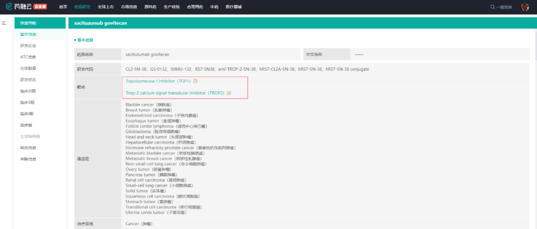 以云顶新耀sacituzumab govitecan为例,在药融云企业版数据库中,直接输入sacituzumab govitecan,全生命周期数据一站式呈现。