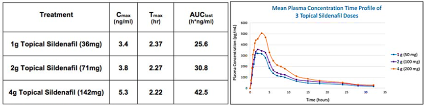 3.6% 西地那非乳膏的I期临床研究在20名健康绝经后女性中进行,结果表明临床相关剂量下局部应用西地那非乳膏安全且耐受性良好,受试者反馈产品使用方便且易吸收。单次给药1g、2g和4g的3.6% 西地那非乳膏后,西地那非成功穿过外阴皮肤和阴道上皮进入全身循环(图1),1g和2g剂量未出现明显全身或皮肤不良反应,预计该乳膏耐受性良好且无口服 PDE5 抑制剂的全身副作用(血药浓度系相对于男性口服西地那非后的血药浓度极低)。