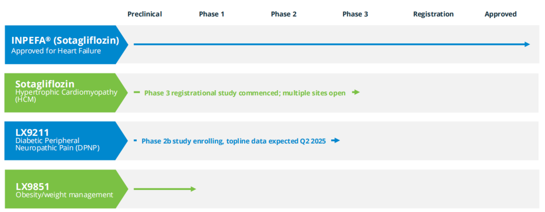 2022年5月,Lexicon重新递交索格列净治疗心衰的NDA申请。2023年5月,FDA批准索格列净(商品名Inpefa™,每日一次的口服片剂),用于降低患有心力衰竭,或患有2型糖尿病、慢性肾病,以及其它心血管危险因素的成人患者的心血管死亡、因心力衰竭而住院或接受急救的风险。