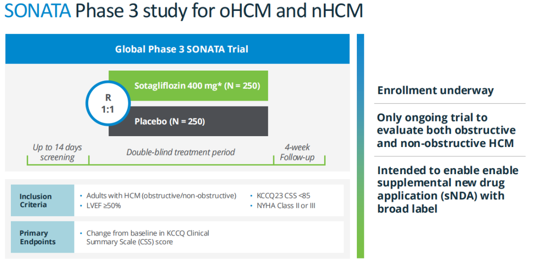 Inpefa™(索格列净)除了已获批治疗心衰以外,还在被研究用于治疗肥厚性心肌病(HCM),关键3期临床试验SONATA已启动,患者招募正在进行中。