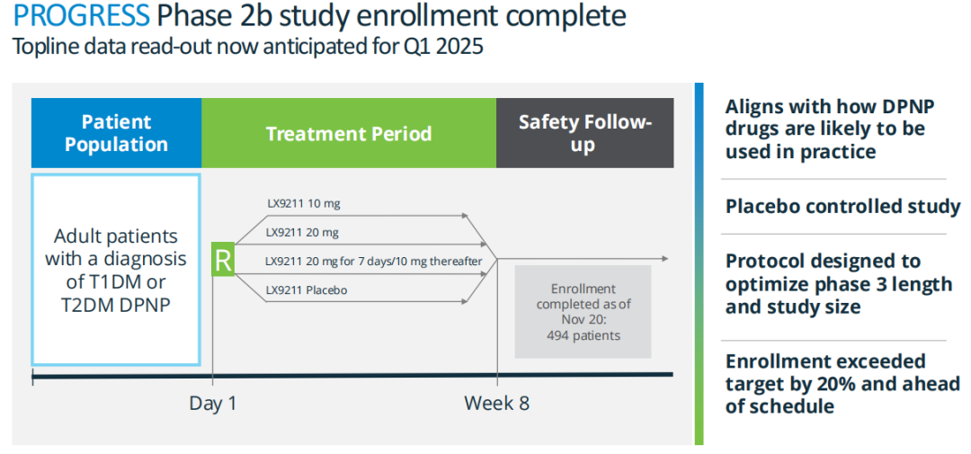 目前,该公司正在开展一项2b期临床试验PROGRESS,以评估LX9211的安全性和耐受性及其对DPNP(糖尿病性周围神经病理性疼痛)的影响,患者入组已提前完成,预计将在2025年第一季度公布顶线数据。美国FDA已授予Lexicon开发LX9211用于治疗DPNP的快速通道指定。