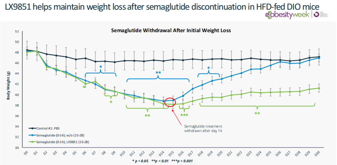 LX9851是一种靶向ACSL5(长链脂酰辅酶A合成酶5)的口服小分子抑制剂,具有解决肥胖和相关心脏代谢疾病未满足需求的潜力。Lexicon的科学家发现ACSL5缺乏的小鼠在临床前模型中的多种代谢综合征指标中表现出有利的表型,包括抵抗饮食诱导的肥胖,以及身体成分的改善。研究显示LX9851有助于HFD(高脂肪饮食)喂养的DIO小鼠在停用司美格鲁肽后维持体重减轻。Lexicon预计将在2025年中递交LX9851用于肥胖症/体重管理的IND申请。