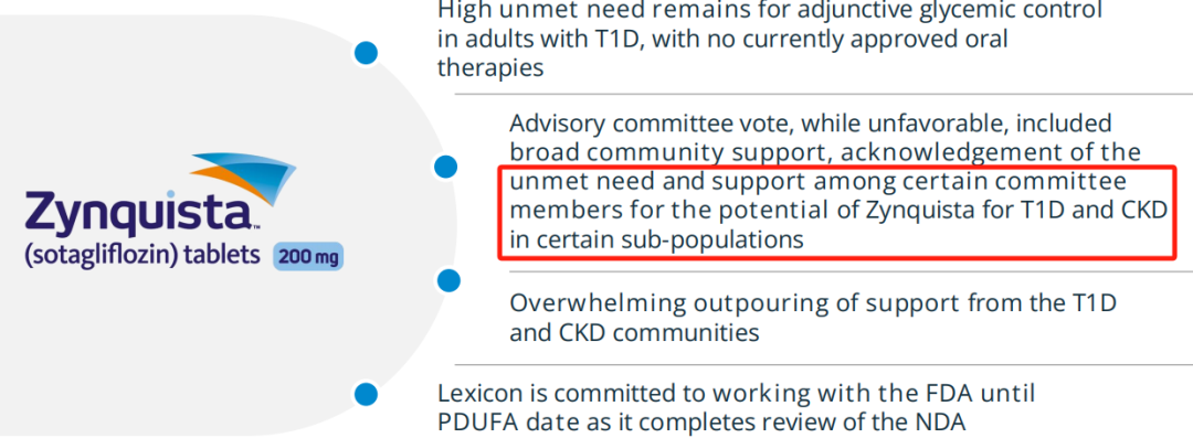 10月31日,FDA内分泌和代谢药物咨询委员会以11:3的投票结果认为索格列净在T1D和CKD患者中的风险大于获益。虽然投票结果不利,但是索格列净依然获得了广泛的患者群体支持,且部分委员会成员表示支持在T1D和CKD患者的某些亚群中使用索格列净。这让Lexicon还抱有一丝希望。