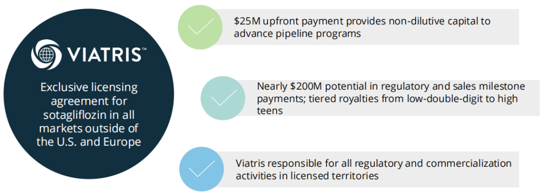 另外,Lexicon在2024年10月与晖致(Viatris)达成合作,将索格列净在美国和欧洲以外地区所有适应症的独家商业化权利授予晖致,Lexicon则保留在美国和欧洲的权利。根据该协议,Lexicon获得2500万美元预付款,为推进管线项目提供了非稀释性资本,并有资格获得近2亿美元里程碑付款,以及分级版税。