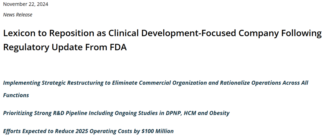 [5] https://www.lexpharma.com/media-center/news/2024-11-22-lexicon-to-reposition-as-clinical-development-focused-company-following-regulatory-update-from-fda;