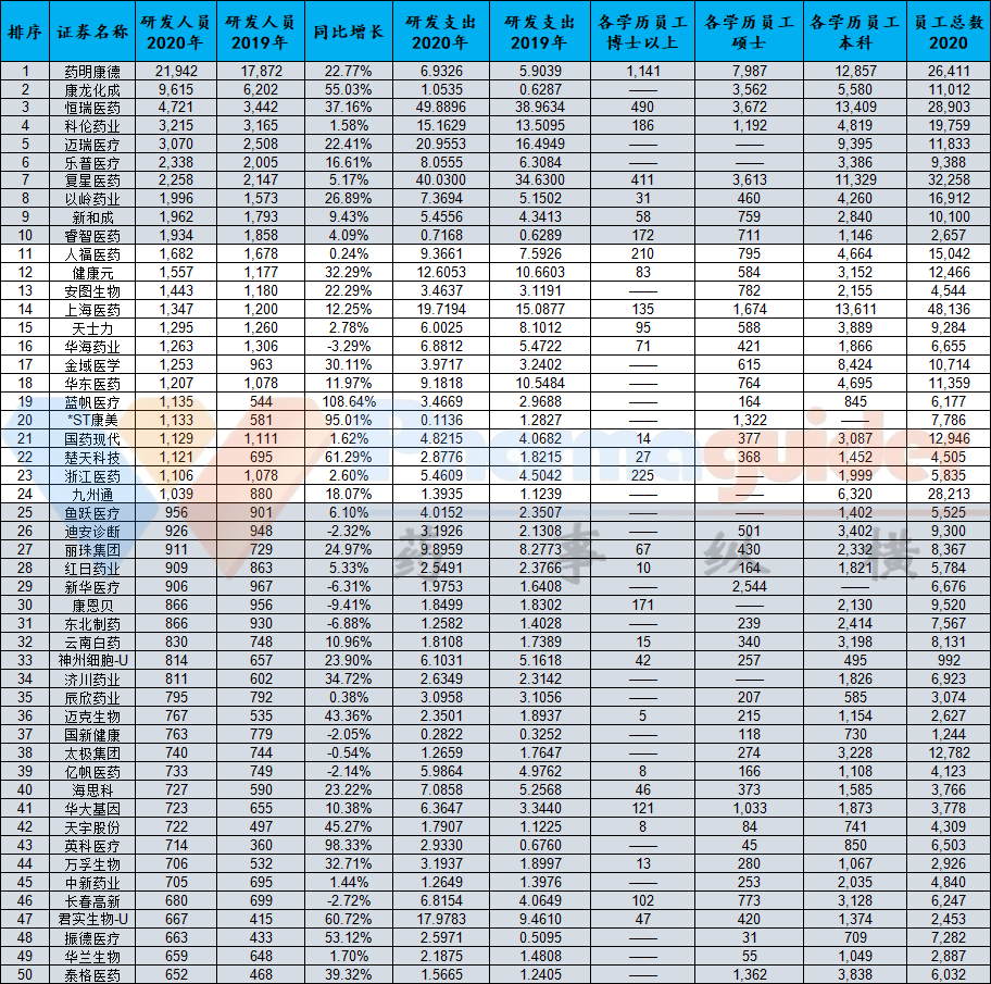 据申万行业分类,我们选取A股上市的所有医药生物公司(港股未披露相关数据),按照2020年报披露,研发人员数量Top50排序如下: