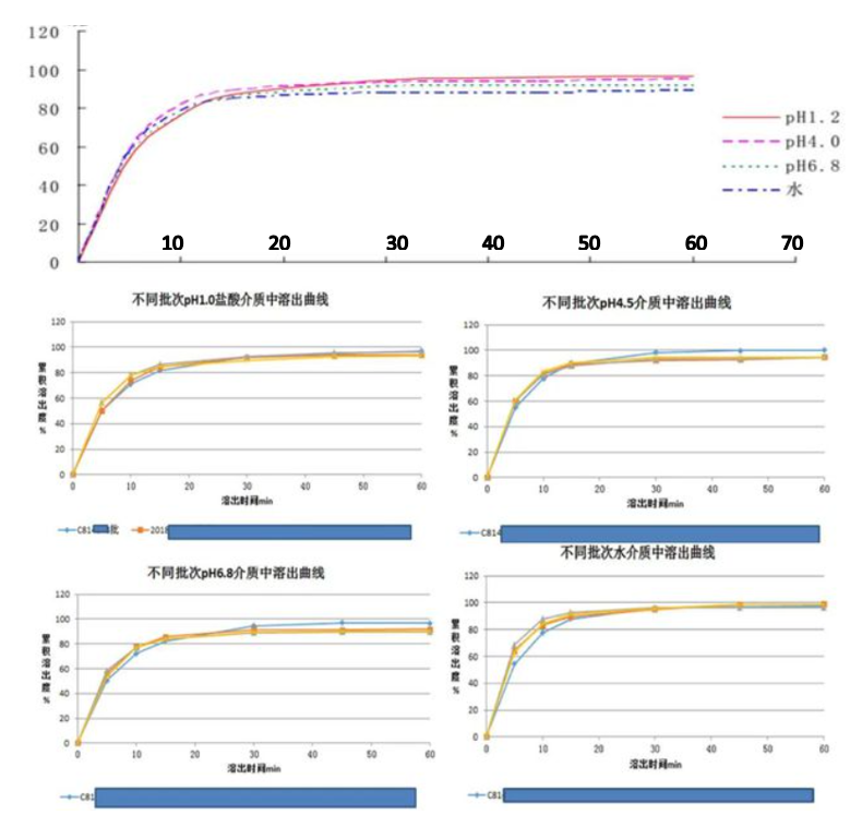 例如某普通片剂的PH-溶解度依赖性曲线得知其无PH依赖性,不同批次样品在四种介质中无明显差异,批间/批内样品内在质量相一致。