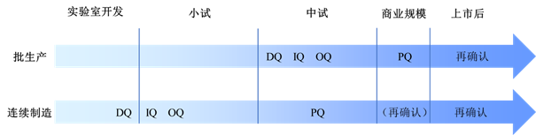 对于连续制造,由于其批量具有很大程度的可变性,因此一条生产线甚至可以满足实验室规模、中试规模直至商业化规模所需的生产批量范围,设备的服务周期也可能从研发早期就已经开始。中国和国际主流GMP并不要求对实验室研发和中试批次的设备进行4Q确认,但考虑到设备生命周期的前移,设备确认活动也应当适当前移。对于有成熟质量管理体系的制药企业,建议其设备采购前就做好URS,设备入场安装时做好DQ和IQ,在设备运行前做好OQ,在工艺参数基本确定后开展PQ。对于质量体系尚未建立的初创企业和中小型企业,由于无法在研发早期开展完善的质量保证活动,因此应当在设备供应商比选时,选择有资质、有制药行业经验的设备供应商,在供应商协助下开展非受控体系下的4Q活动,同时应当保存好设备的FAT(Factory Acceptance Test,工厂验收测试)和SAT(Site Acceptance Test,现场验收测试)文件和所有的技术文件,以备后期追溯。一种连续制造和批生产的4Q时间节点设计方式如图1所示。与传统设备确认相比,连续制造的设备确认大幅前移,在小试阶段就可以完成3Q确认,在中试时,如果设备运转稳定,即可开展PQ。工艺放大至商业规模时,根据工艺变更情况,可以选择是否开展再确认活动。