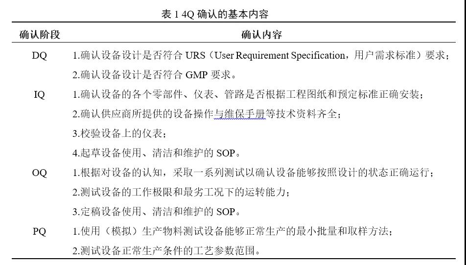 设备确认的目的是根据拟生产药品的工艺,对设备的设计和选型、安装与运行、对产品的适用性等做出评估,同时也为制定设备使用SOP、维护SOP奠定基础。设备确认的步骤包括“4Q”,即DQ(Design Qualification,设计确认)、IQ(Installation Qualification,安装确认)、OQ(Operational Qualification,运行确认)和PQ(Performance Qualification,性能确认),按顺序依次进行。其中对于一些原理简单、功能单一,或“即插即用”型的设备,常把IQ和OQ合并进行,称为IOQ。“4Q”确认的基本内容如表1所示。