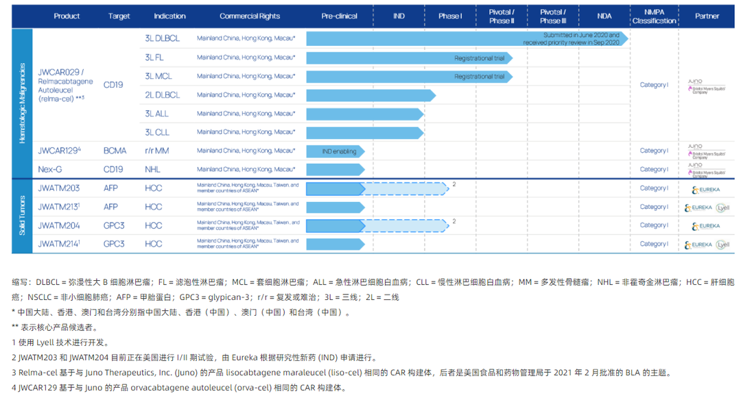 2020年6月30日,药明巨诺提交的瑞基仑赛注射液上市申请获得CDE受理,是国内继复星凯特益基利仑赛之后第2款申报上市的CAR-T疗法。药明巨诺(港交所代码:2126)是一家领先的细胞免疫治疗公司,由巨诺医疗(一家百时美施贵宝的公司)和药明康德联合创建。公司已建立了一个专注为血液及实体瘤开发、制造和商业化的突破性细胞免疫疗法的一体化平台。药明巨诺的 JWCAR029 已获的“优先审评+突破性药物”双重审评资格。