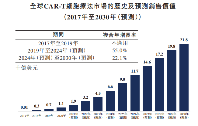 自2017年首批两个CAR-T产品获批以来,全球CAR-T市场一直在迅速扩大。全球CAR-T市场规模已从2017年的0.1亿美元增长到2019年的7亿美元,预计全球CAR-T细胞疗法市场的销售价值达至2024年的66亿美元,2019年至2024年的复合年增长率为55.0%。截至2030年,按销售价值计,全球CAR-T市场规模预计达至218亿美元,2024年至2030年的复合年增长率为22.1%。