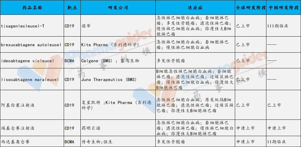 对于大多数B细胞恶性肿瘤(例如NHL),所有患者的癌细胞中CD19均为正常至高水平。获FDA批准的五种CAR-T细胞疗法的四种(即Breyanzi、Tecartus、Yescarta及Kymriah)靶向CD-19。在中国,刚获批的复星凯特的CAR-T产品和已经递交上市申请的药明巨诺的CAR-T产品都是靶向CD19。