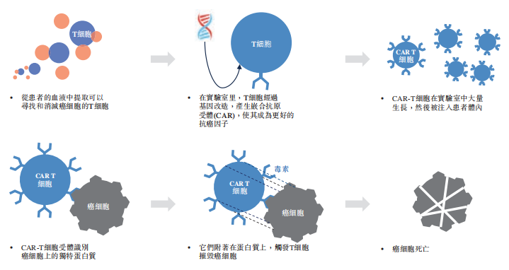 CAR-T细胞是经基因改造的T细胞,配备有嵌合抗原受体(CAR),它能使T细胞识别并消灭表达相应抗原的细胞。自体CAR-T细胞是通过从患者血液中取出T细胞,并通过带有对CAR结构编码的质粒的病毒载体转染等方式,使T细胞表达所需的CAR而产生的。