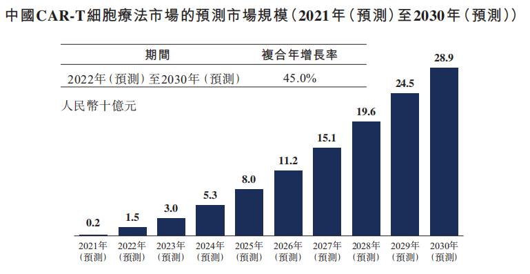 Frost&Sullivan估计今年中国CAR-T疗法的市场规模为人民币2亿元。预计中国CAR-T细胞疗法市场规模将增长至2024年的人民币53亿元,并进一步增长至2030年的人民币289亿元,2022年至2030年的复合年增长率为45.0%。