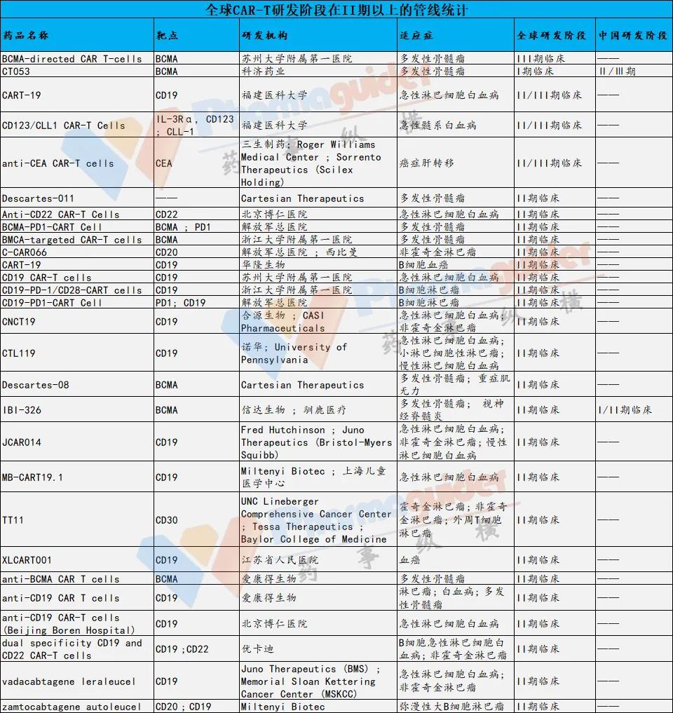 截止到发稿日,目前全球 CAR-T 细胞疗法研发管线从临床前到三期有580个左右,临床1期研发管线有290个。处于Ⅱ期阶段及以上的有27个,其中大部分针对CD19靶点。目前据统计注册于 Clinicaltrials 上的国内 CAR-T 临床试验已超 365 项。