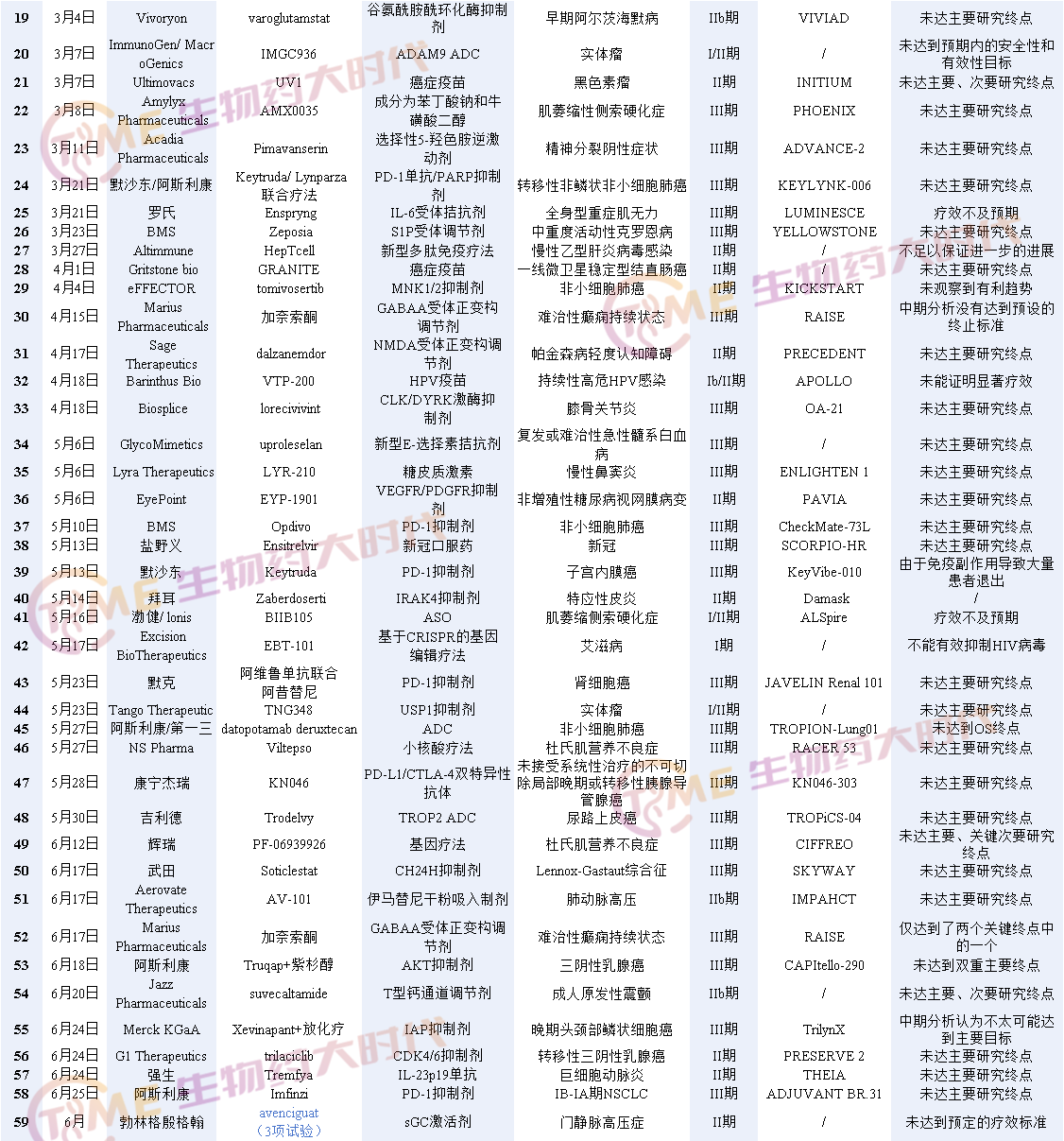 · 6月12日,辉瑞宣布其杜氏肌营养不良症基因疗法PF-06939926治疗杜氏肌营养不良症(DMD)的III期临床CIFFREO失败,与安慰剂相比,PF-06939926在III期试验中未达到主要和关键次要终点。